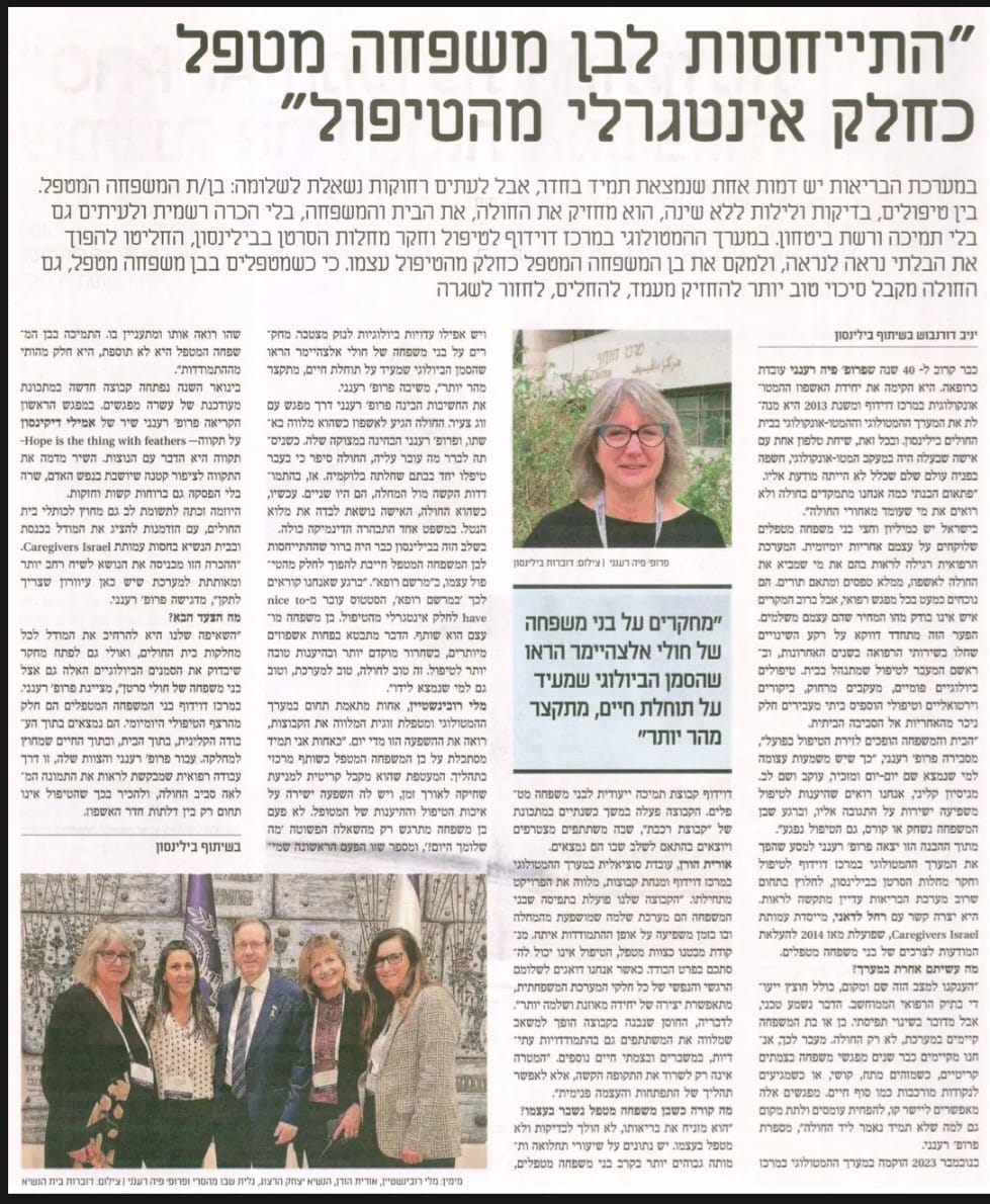 "הענקנו למצב הזה שם ומקום, כולל חצץ ייעודי בתיק הרפואי הממוחשב. הדבר נשמע טכני, אבל מדובר בשינוי תפיסתי. כן או בת המשפחה קיימים במערכת, לא רק החולה. מעבר לכך, אנחנו מקיימים כבר שנים מפגשי משפחה בצמתים קריטיים, כשמזהים מתח, קושי, או כשמגיעים לנקודות מורכבות כמו סוף חיים. מפגשים אלה מאפשרים ליישר קו, להפחית עומסים ולתת מקום גם למה שלא תמיד נאמר ליד החולה", מספרת פרופ' רענני.